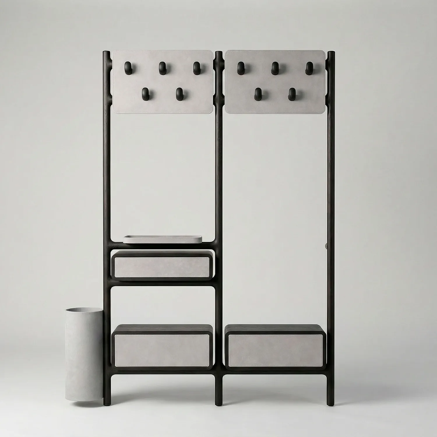 Элегантный цилиндрический модуль в отделке из натуральной кожи. Зонтница LETTA — это пример того, как утилитарный предмет становится изысканным арт-объектом. Она бережно хранит зонты-трости, поддерживая идеальный порядок и подчеркивая внимание к каждой детали вашего быта.