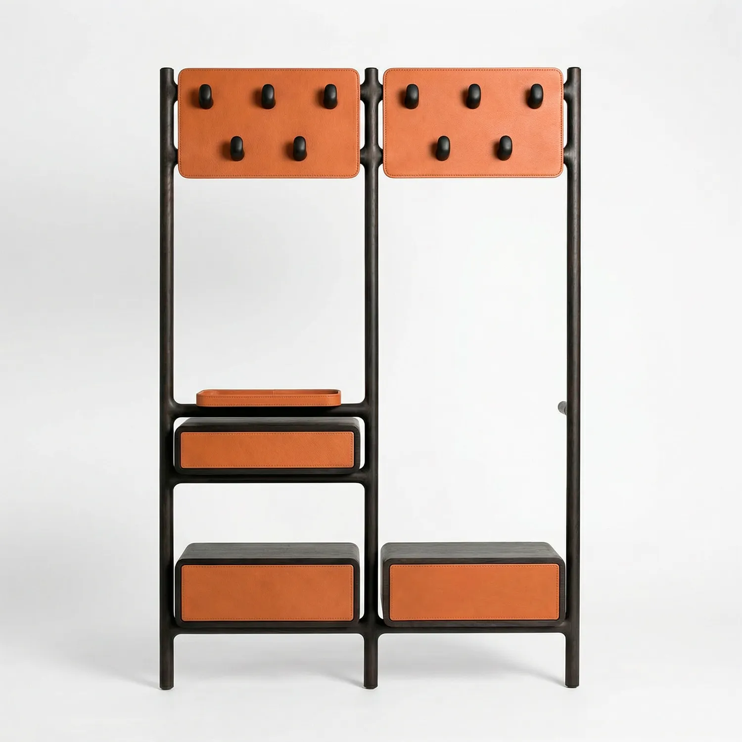 Функциональное сердце прихожей. Крючки обтекаемой формы расположены на широких панелях из натуральной кожи, закрепленных на каркасе из массива. Открытый тип хранения позволяет повесить верхнюю одежду за секунду, избавляя от лишних движений. Кожаная подложка служит изысканным фоном, превращая привычную вешалку в объект высокого дизайна.