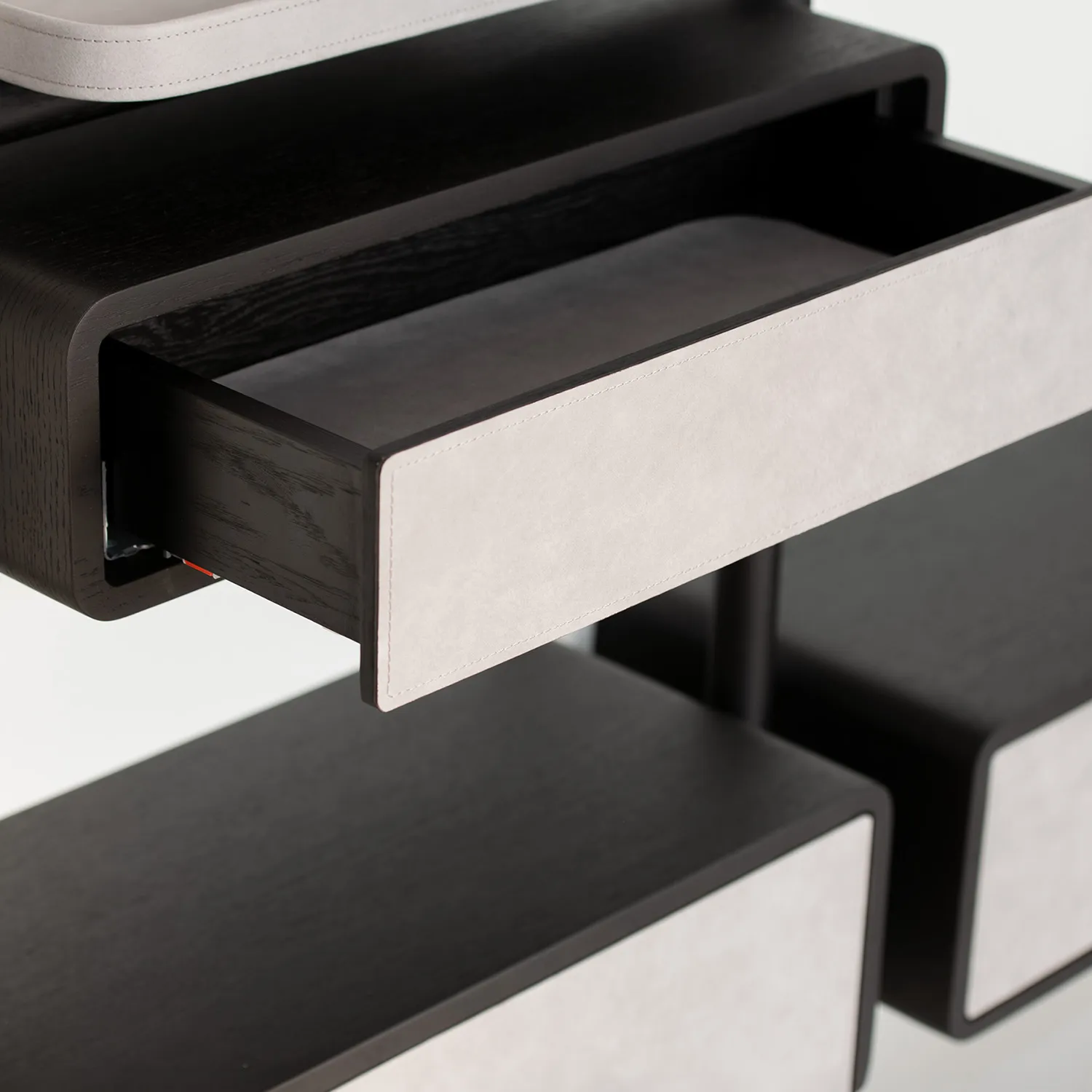 Вместительные модули в шпоне ясеня, созданные для хранения сезонных аксессуаров — от мягких шарфов до перчаток. Фасады, обтянутые натуральной кожей с деликатной прострочкой, скрывают «визуальный шум», оставляя на виду лишь благородную фактуру материалов. Плавный ход ящиков и премиальная фурнитура превращают каждое прикосновение в удовольствие.